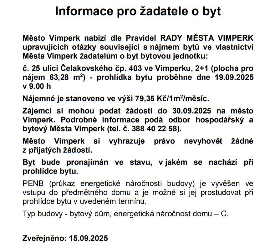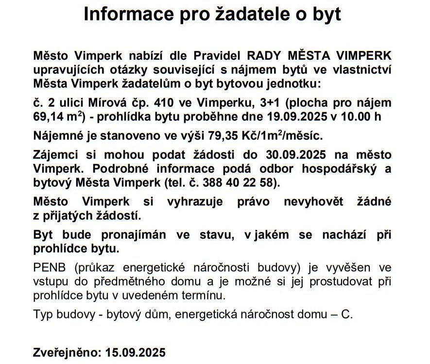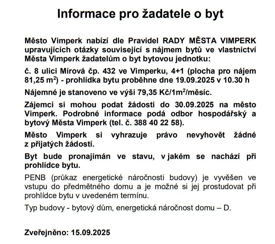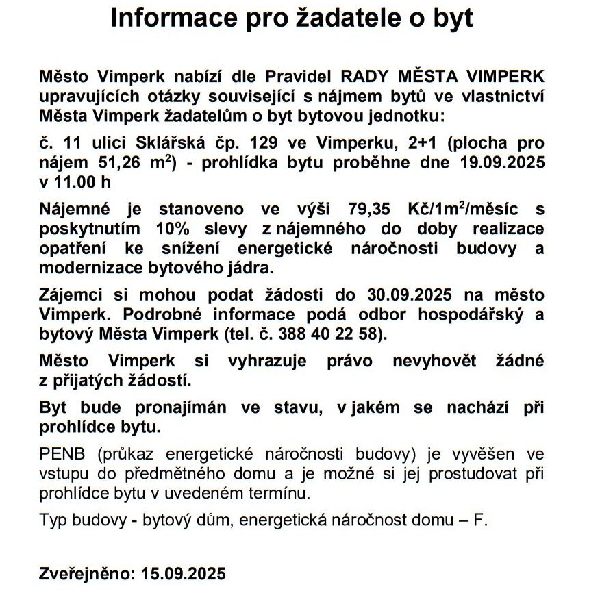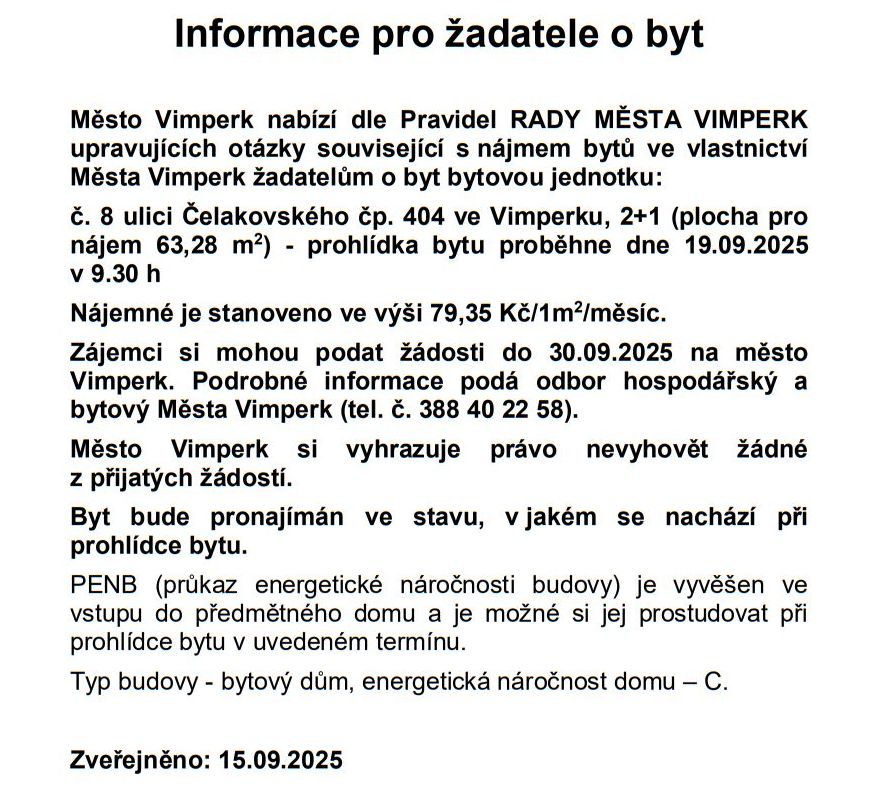Domů ZPRÁVY Z MĚSTA A OKOLÍ NAŠE MĚSTO VIMPERK: Radnice nabízí k pronájmu pět volných městských bytů