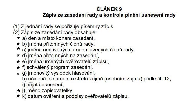 Zde jsou námi zjištěná pochybení. Hvězdičkami jsme v jednacích řádech označili náležitosti, které v dokumentech zveřejněných na webu radnice chybějí: