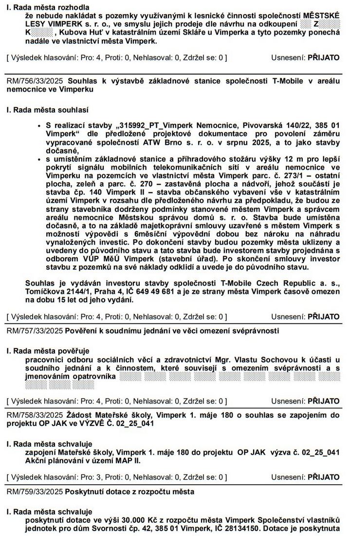 NAŠE MĚSTO VIMPERK: Usnesení ze zasedání rady města konané 22. září 2025