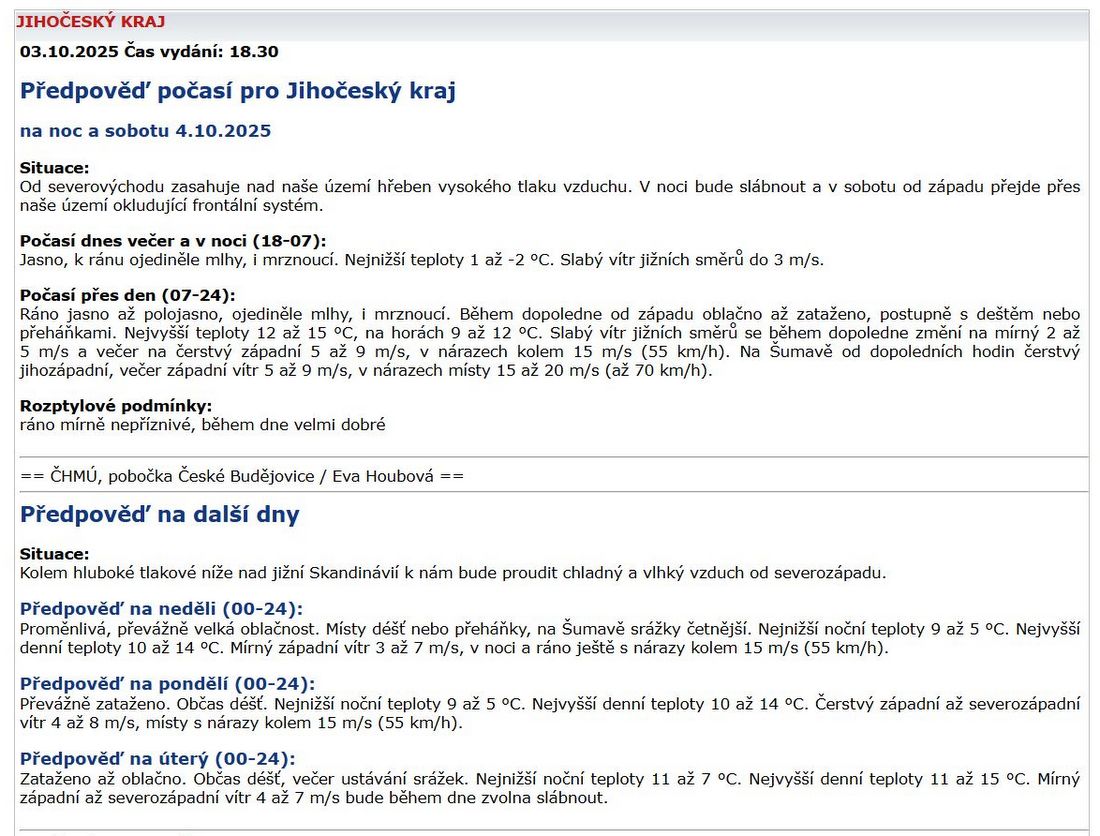 ČESKÝ HYDROMETEOROLOGICKÝ ÚSTAV: Předpověď počasí – 4. října