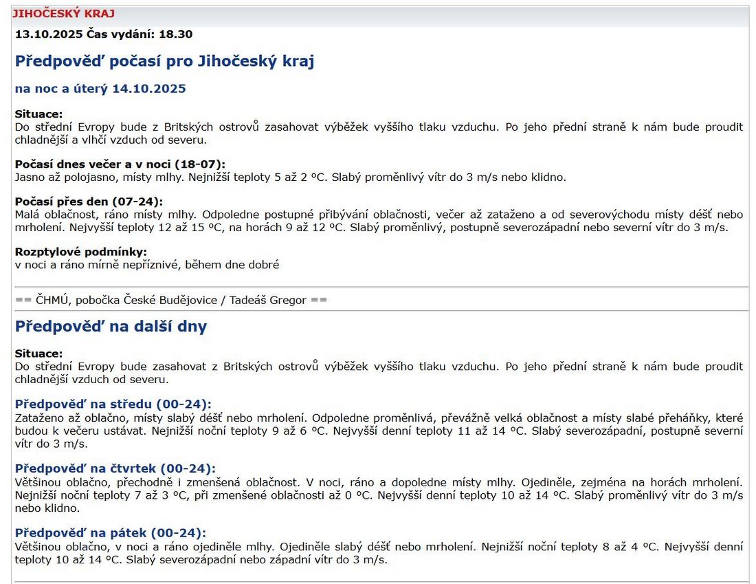 ČESKÝ HYDROMETEOROLOGICKÝ ÚSTAV: Předpověď počasí – 14. října