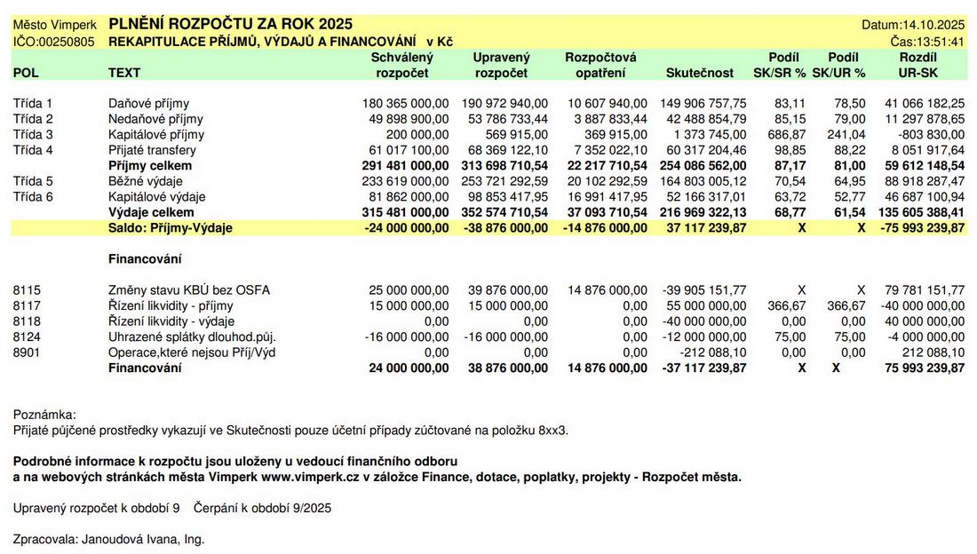 NAŠE MĚSTO VIMPERK: Radnice informuje o plnění rozpočtu k 30. 9. 2025