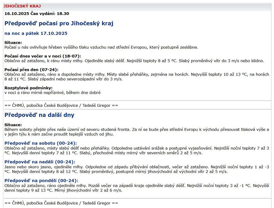 ČESKÝ HYDROMETEOROLOGICKÝ ÚSTAV: Předpověď počasí – 17. října