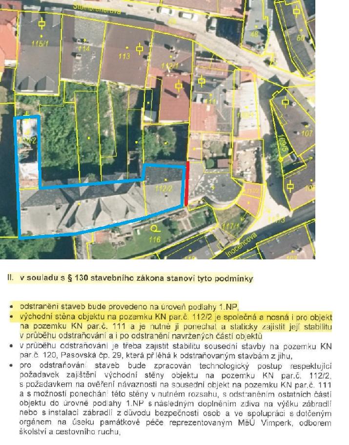 Popis: modře jsou vyznačené objekty nařízené k demolici, červeně stěna, která odděluje budovu tiskáren od soukromého pozemku. Ta měla být podle znaleckého posudku zachována.