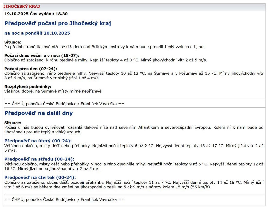 ČESKÝ HYDROMETEOROLOGICKÝ ÚSTAV: Předpověď počasí – 20. října