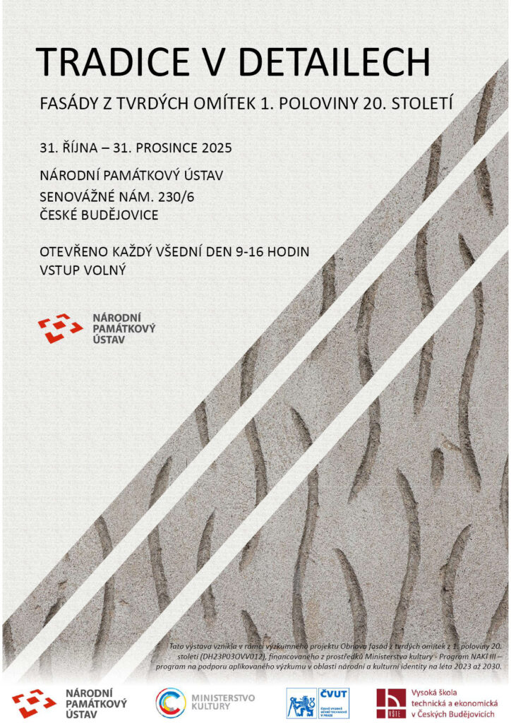 Výstava vznikla v rámci výzkumného projektu Obnova fasád z tvrdých omítek z 1. poloviny 20. století (DH23P03OVV012), financovaného z prostředků Ministerstva kultury ČR – Program NAKI III (2023–2030).