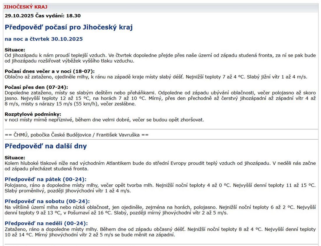 ČESKÝ HYDROMETEOROLOGICKÝ ÚSTAV: Předpověď počasí – 30. října