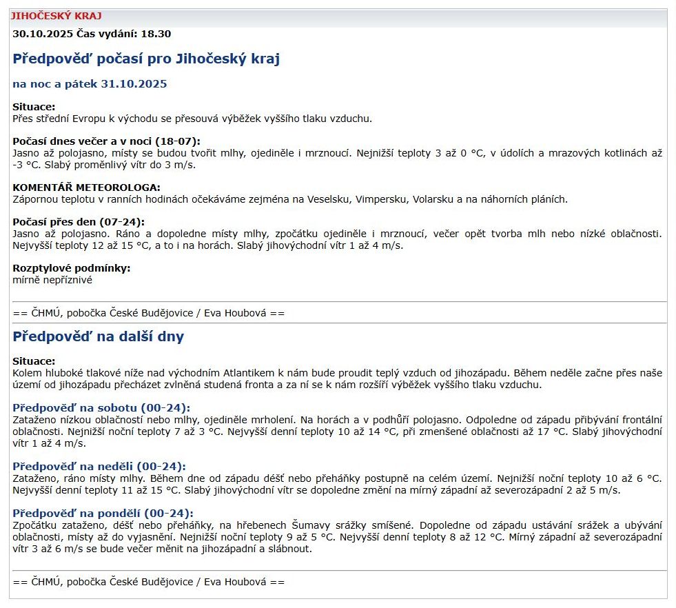 ČESKÝ HYDROMETEOROLOGICKÝ ÚSTAV: Předpověď počasí – 31. října