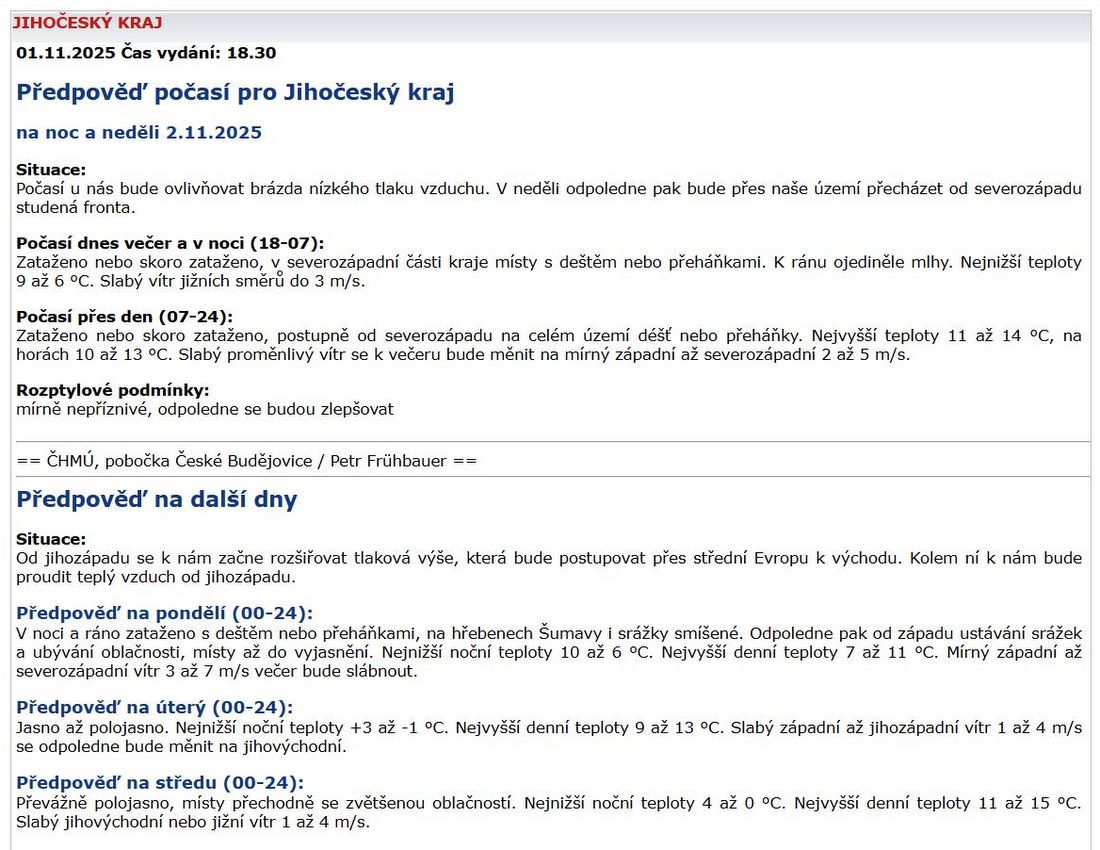 ČESKÝ HYDROMETEOROLOGICKÝ ÚSTAV: Předpověď počasí – 2. listopadu