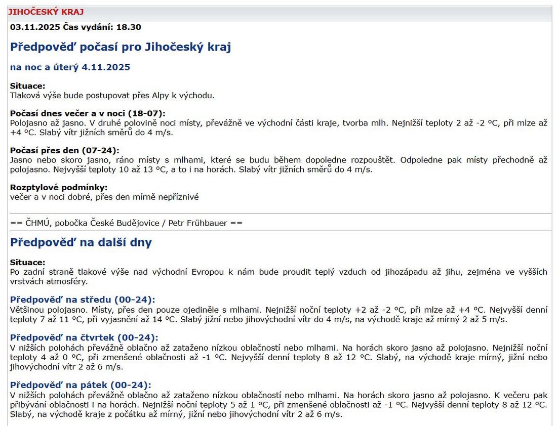 ČESKÝ HYDROMETEOROLOGICKÝ ÚSTAV: Předpověď počasí – 4. listopadu
