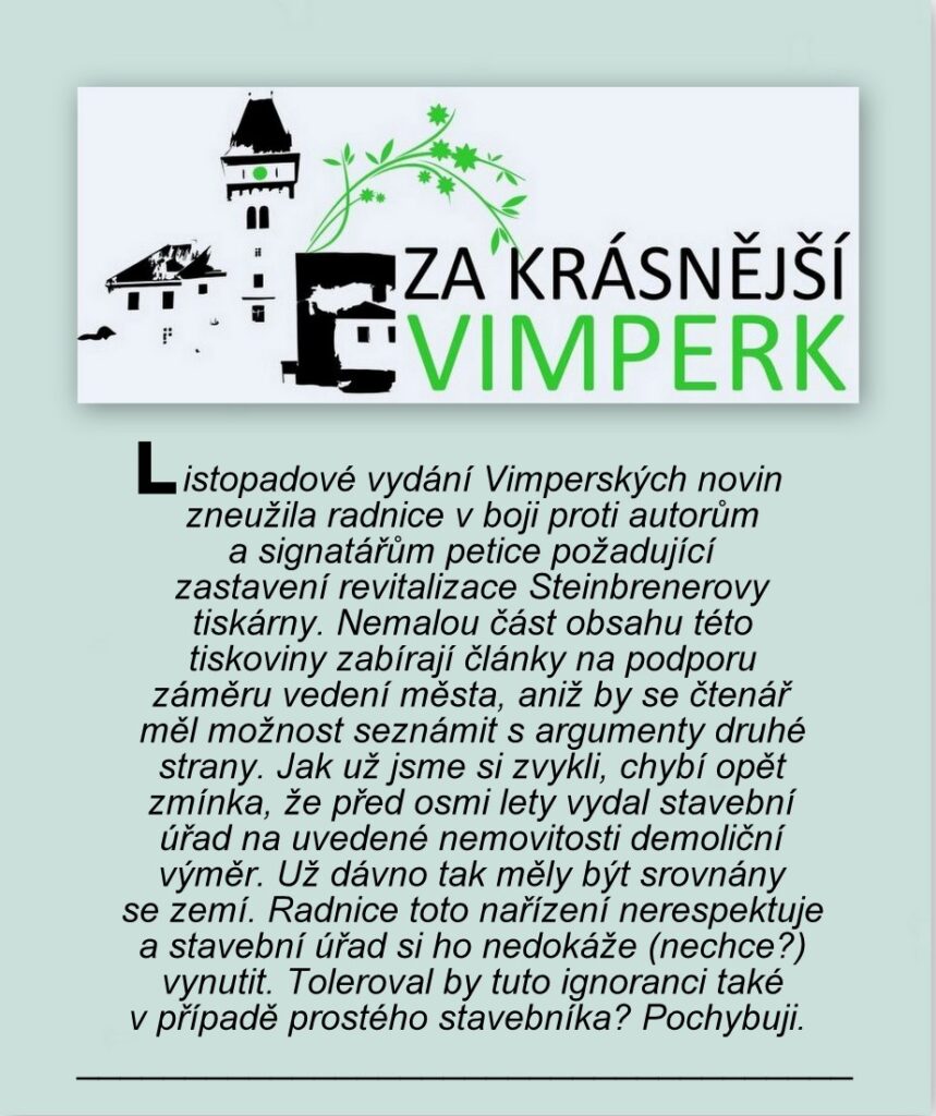 NAŠE MĚSTO VIMPERK – DOKUMENT: Rozhodnutí o nařízení neodkladného odstranění staveb (Steinbrenerova tiskárna)