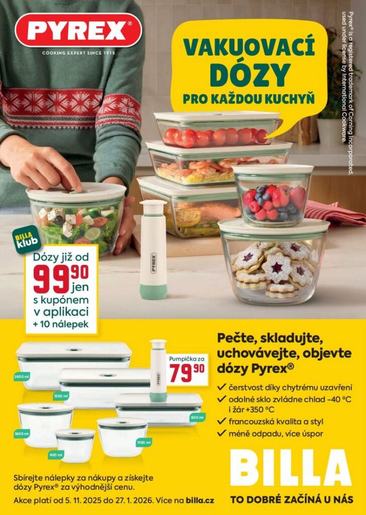 BILLA odstartovala novou věrnostní kampaň, která potěší všechny, kdo mají rádi pořádek v kuchyni a chtějí, aby jejich jídlo zůstalo co nejdéle čerstvé. Tentokrát si mohou zákazníci za nasbírané nálepky pořídit kvalitní vakuovací dózy Pyrex® – odolné proti teplotnímu šoku, elegantní a praktické pro každodenní vaření i uchovávání jídel. Kampaň běží od 5. listopadu 2025 do 27. ledna 2026.