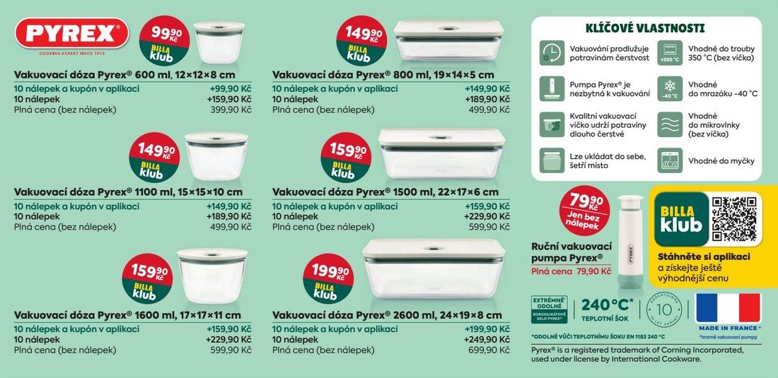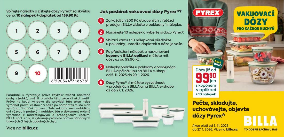 Za každý nákup v hodnotě 200 Kč v prodejnách BILLA získá zákazník jednu nálepku. Po nasbírání deseti nálepek si je pak může vyměnit za vakuovací dózu Pyrex® dle vlastního výběru.