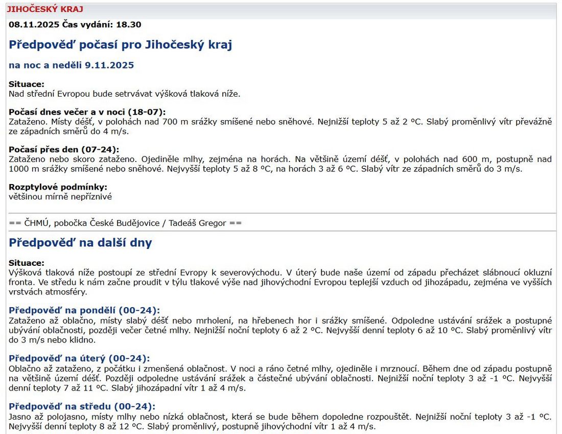ČESKÝ HYDROMETEOROLOGICKÝ ÚSTAV: Předpověď počasí – 9. listopadu
