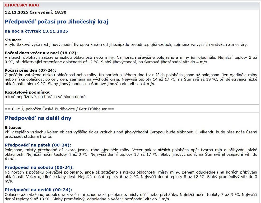 ČESKÝ HYDROMETEOROLOGICKÝ ÚSTAV: Předpověď počasí – 13. listopadu