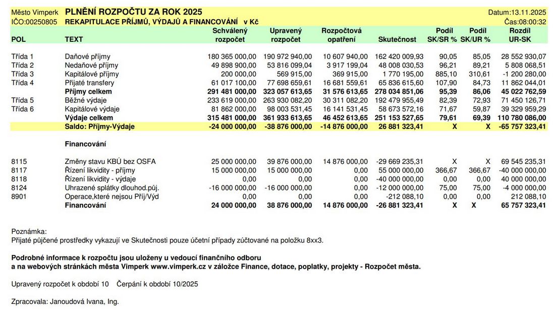 NAŠE MĚSTO VIMPERK: Radnice informuje o plnění rozpočtu k 31. říjnu 2025