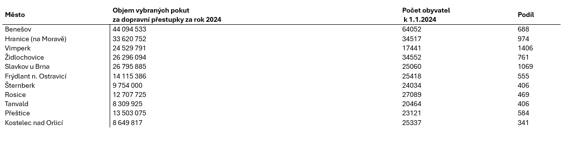 Pomyslným vítězem v přepočtu na obyvatele je jihočeský Vimperk, který s necelými 17,5 tisíce obyvatel inkasoval za rok 2024 přes 24 milionů korun (viz tabulka níže). To odpovídá přibližně 1 406 korunám na obyvatele. Na paty mu šlape Slavkov u Brna (1 069 Kč), Hranice na Moravě (974 Kč).