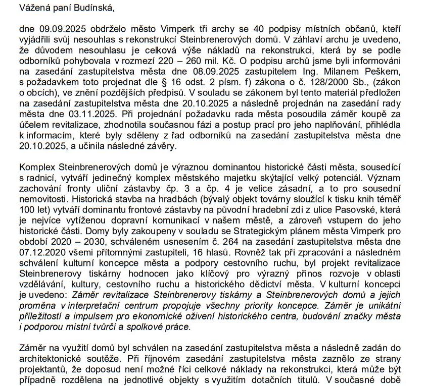 NAŠE MĚSTO VIMPERK – DOKUMENT: Dopis starostky petičnímu výboru ohledně Steinbrenerových domů