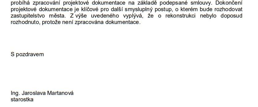 Argumentace města je navíc vychýlená: rozsáhle popisuje urbanistické hledisko, ale vůbec se nevěnuje ekonomickým rizikům, dlouhodobým provozním nákladům ani tomu, co bude muset město omezit nebo odložit, pokud projekt skutečně spolkne čtvrt miliardy korun. Nezaznělo, z jakých zdrojů by byla rekonstrukce hrazena a zda existuje reálné riziko budoucího zadlužení.