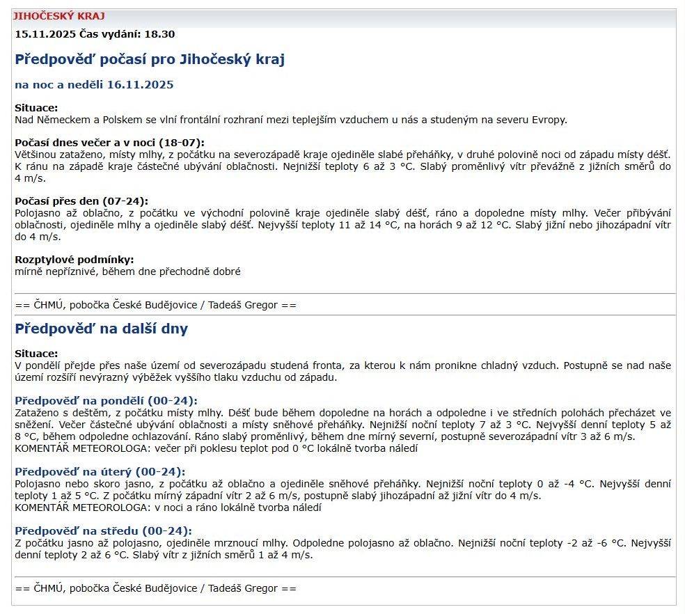 ČESKÝ HYDROMETEOROLOGICKÝ ÚSTAV: Předpověď počasí – 16. listopadu