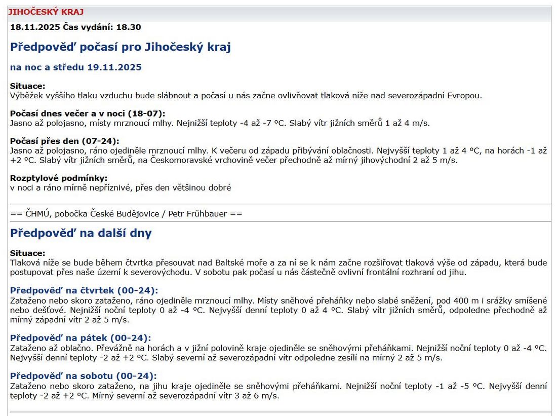 ČESKÝ HYDROMETEOROLOGICKÝ ÚSTAV: Předpověď počasí – 19. listopadu
