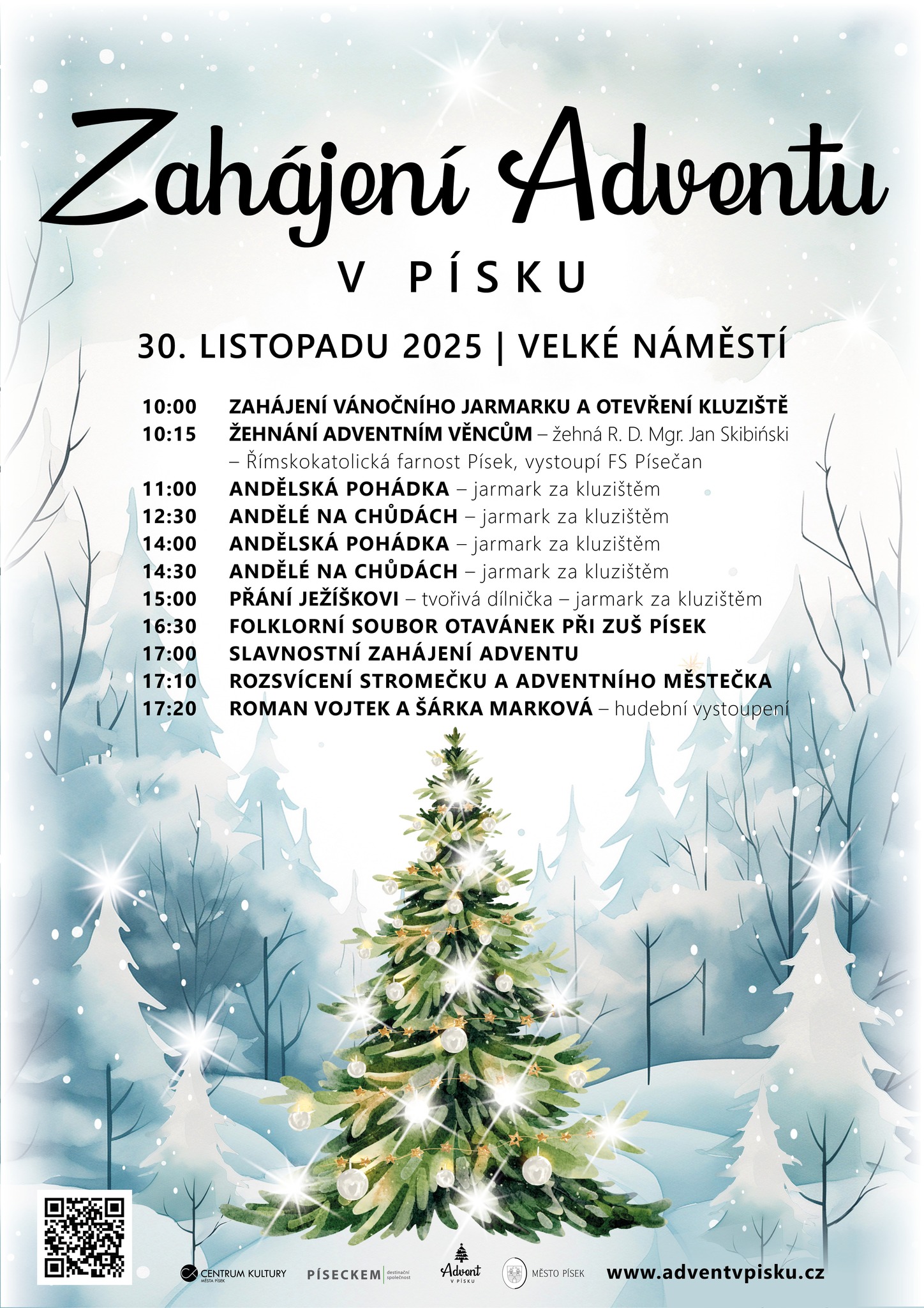„Měsíc trvající akci odstartujeme na Velkém náměstí v neděli 30. listopadu, dopoledne otevřeme ledové kluziště, odpoledne se po náměstí budou pohybovat andělé na chůdách a v podvečer rozsvítíme vánoční strom i adventní městečko. Pak si lidé budou moci poslechnout zpěváky Romana Vojtka a Šárku Markovou,“ řekl Josef Kašpar, ředitel Centra kultury města Písek, které akci Advent v Písku i letos pořádá. Kluziště a adventní městečko, kde si lidé budou moci koupit tradiční dobroty a vánoční zboží, budou otevřeny do 2. ledna. Vstup na kluziště bude opět zdarma, brusle si bude možné půjčit na místě.