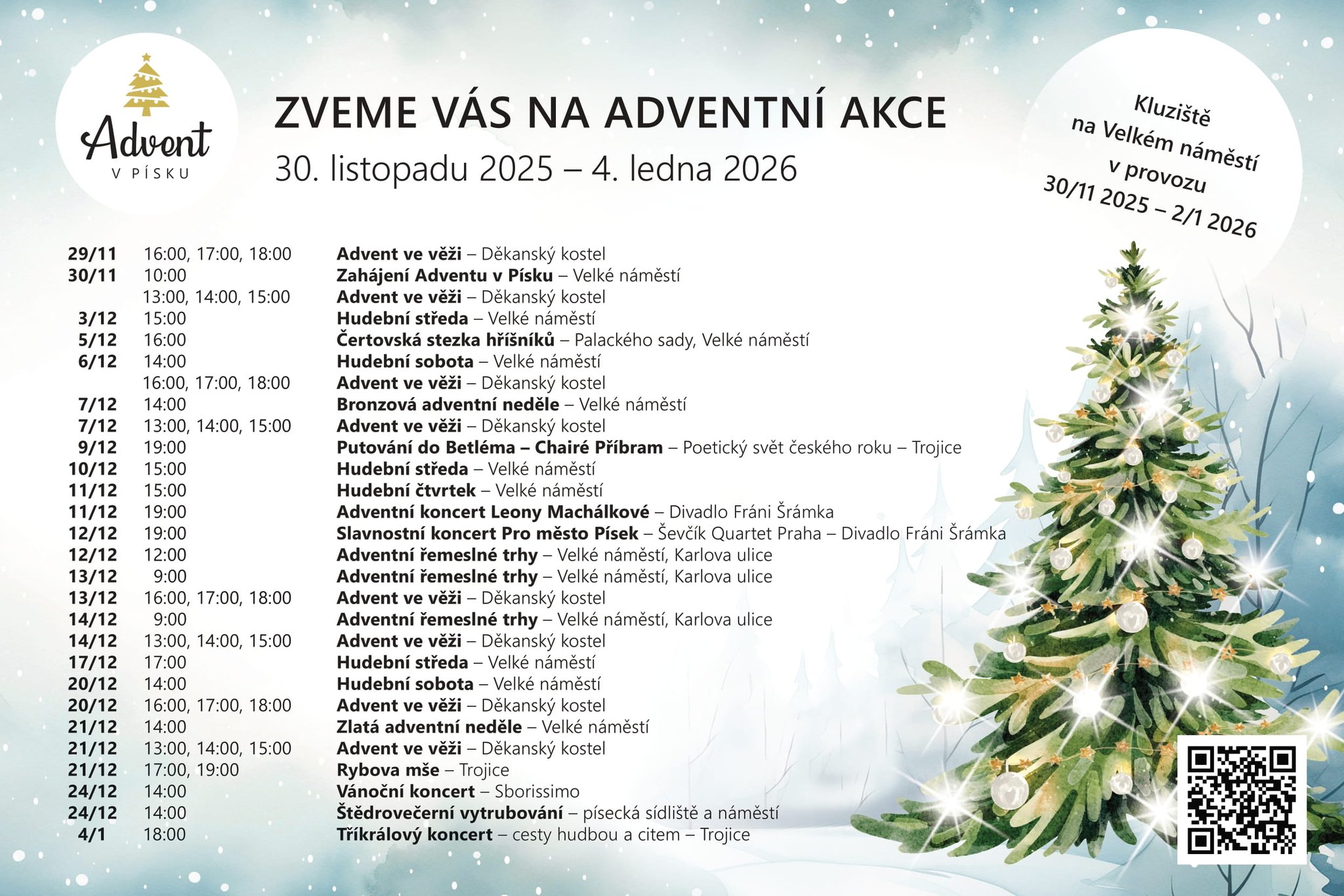 Advent v Písku nabídne i letos venkovní ledové kluziště, řemeslné trhy, betlémy i mnoho hudebních vystoupení místních sborů, spolků, škol či profesionálních umělců. Novinkou pak budou speciální adventní prohlídky věže děkanského kostela a „dobrostánek“ v adventním městečku, ve kterém se budou prezentovat neziskové a charitativní organizace. Na Štědrý den pak nebude chybět oblíbené štědrovečerní vytrubování.