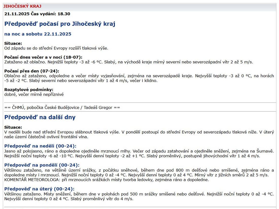 ČESKÝ HYDROMETEOROLOGICKÝ ÚSTAV: Předpověď počasí – 22. listopadu