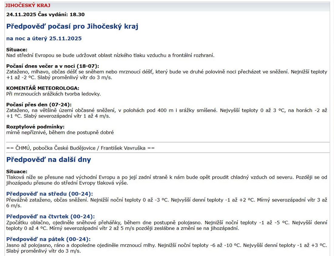 ČESKÝ HYDROMETEOROLOGICKÝ ÚSTAV: Předpověď počasí – 25. listopadu