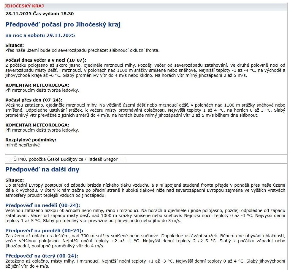 ČESKÝ HYDROMETEOROLOGICKÝ ÚSTAV: Předpověď počasí – 29. listopadu