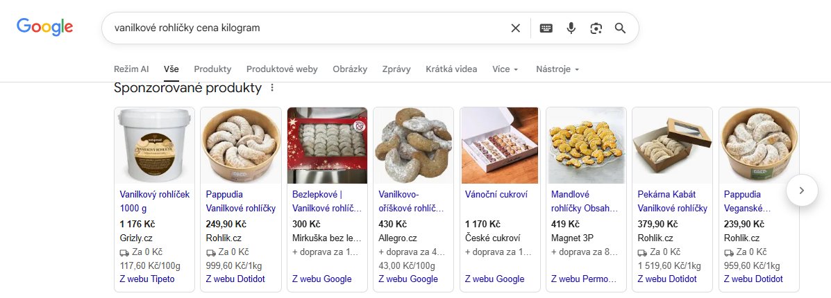 Přitom některé obchody letos nabízejí kilogram rohlíčků třeba i za cenu v rozmezí přibližně od 1000 do 1500 (viz obrázek níže). Zadání výrazu „vanilkové rohlíčky cena kilogram“ do vyhledávače nabídne třeba rohlíčky z pekárny Kabát, prostřednictvím dovážkové služby http://Rohlík.cz, za takřka 1520 Kč za kilogram, s deklarovanou nulovou cenou přepravy. Kilogramové balení rohlíčků od http://Grizly.cz vyjde na 1176 Kč. Na http://Rohlík.cz pak lez objednat i rohlíčky Pappudia, za zhruba 1000 Kč za kilogram.