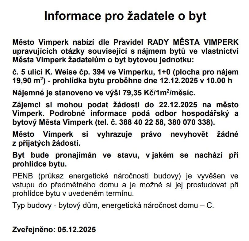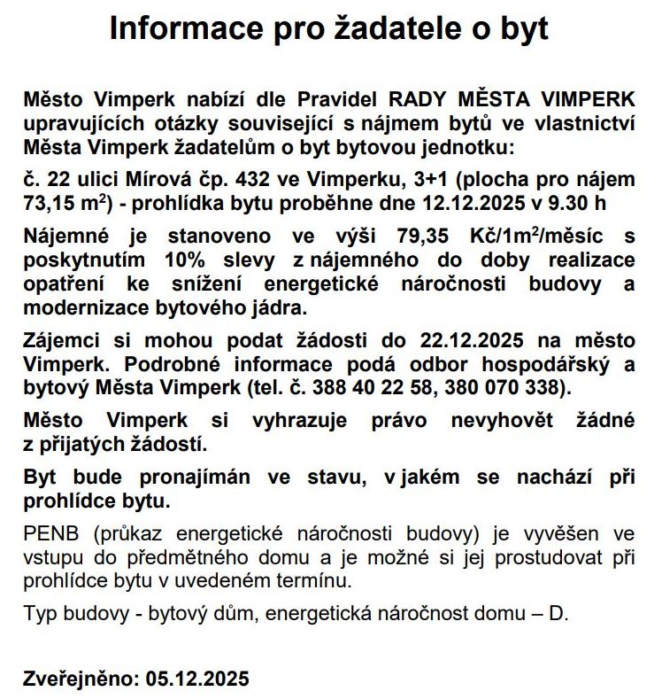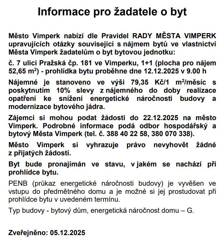 NAŠE MĚSTO VIMPERK: Radnice nabízí k pronájmu tři volné městské byty