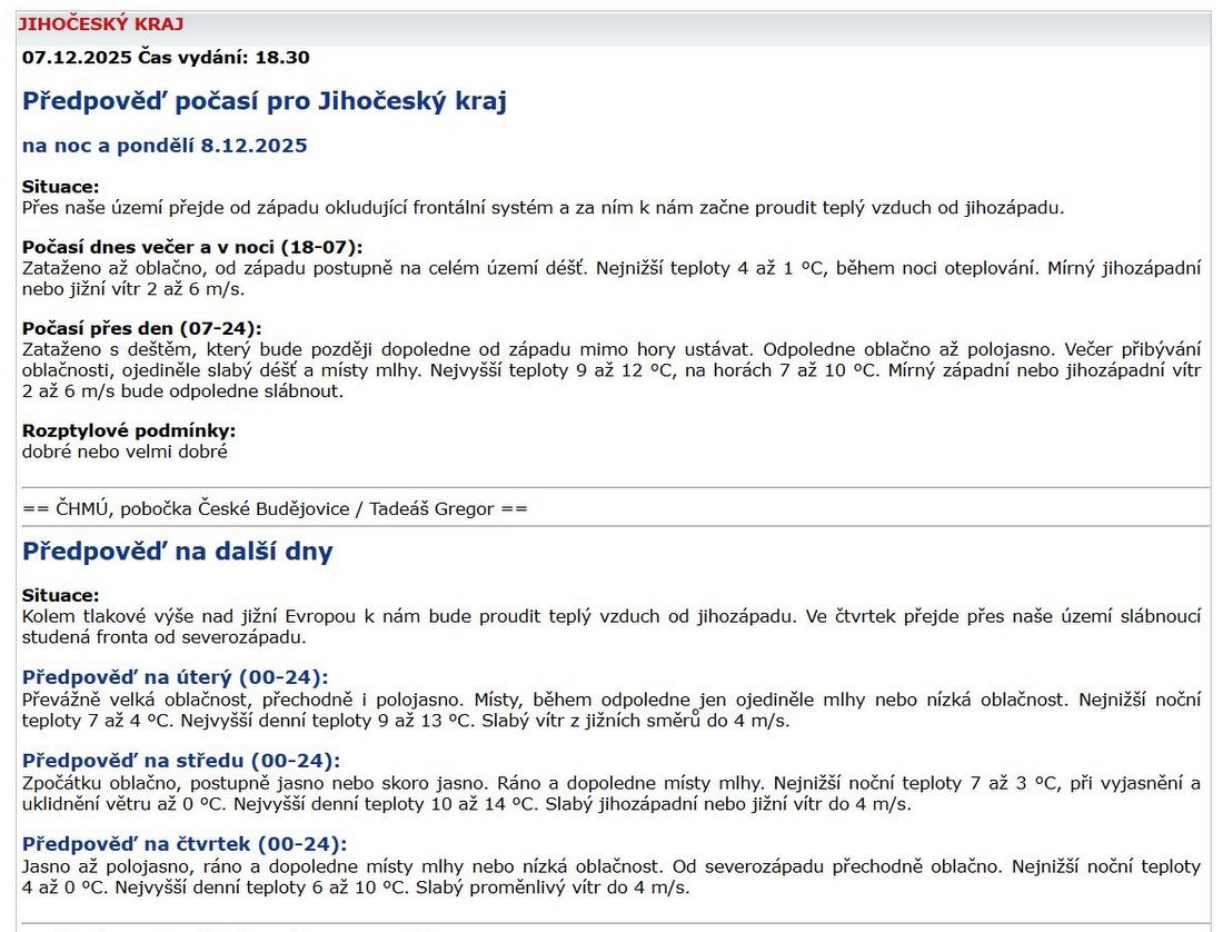 ČESKÝ HYDROMETEOROLOGICKÝ ÚSTAV: Předpověď počasí – 8. prosince