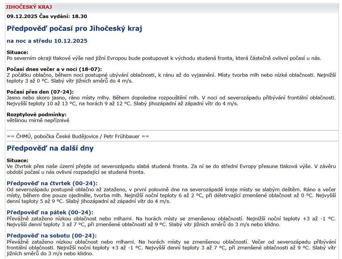 ČESKÝ HYDROMETEOROLOGICKÝ ÚSTAV: Předpověď počasí – 10. prosince