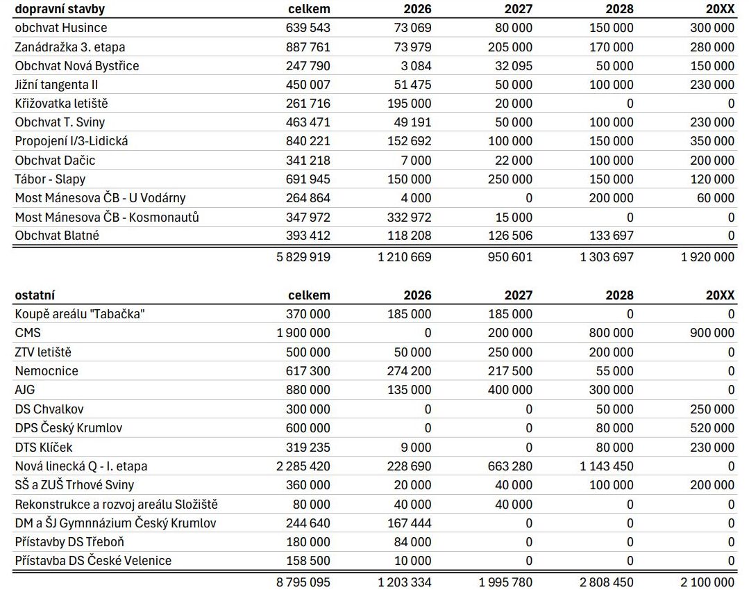 „Částka rozpočtu sice činí zhruba 27 miliard korun, ale její převážnou část tvoří transfery na platy učitelů a pracovníků v sociální oblasti. Peníze, o kterých dnes zastupitelstvo fakticky rozhodovalo, tak představují přibližně 12 miliard korun,“ doplnil 1. náměstek hejtmana Tomáš Hajdušek. V roce 2026 půjde více než 2,8 miliardy korun do dopravních staveb (z toho 2,3 mld. vlastních prostředků a více než 0,5 mld. v rámci evropských projektů). K zásadním akcím bude patřit zahájení jižního obchvatu Blatné a Tábora, nové křižovatky u letiště, propojení Krumlovské a Lidické ulice a rekonstrukce mostu Kosmonautů v českobudějovické Mánesově ulici.