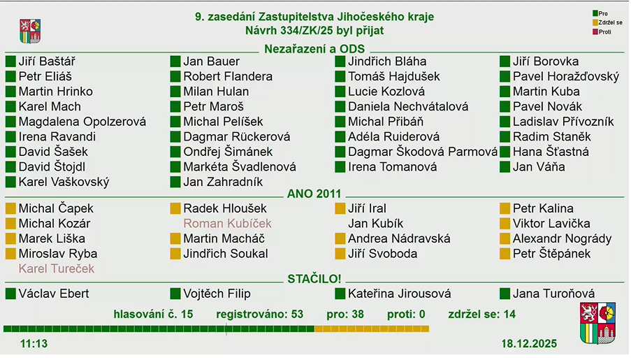„Máme schválený rozpočet na rok 2026 a jsem za to rád. Chci poděkovat všem zastupitelům, kteří ho podpořili, včetně těch z opozice. Považuji ho za rozpočet, který bude přinášet do Jihočeského kraje realizaci všech slibů, které jsme dali. Projekty, které byly dosud jen na papíře nebo v přípravné fázi, nyní postupně přecházejí do realizace. Týká se to zejména dopravních staveb, kde dokončujeme přípravu akcí, jako je most do Papírenské, obchvat Trhových Svinů, obchvat Husince nebo zahájení stavby obchvatu Tábora v lokalitě Tesco–Slapy. Jsou to věci, na které se tady roky čekalo a které se začínají měnit v realitu,“ uvedl hejtman Jihočeského kraje Martin Kuba. Upozornil, že kraj směřuje prostředky také do projektů zaměřených na dostavbu sociálních domovů, školství a výstavbu rozsáhlého sociálního zařízení v dolním areálu nemocnice v Českých Budějovicích. „Rozpočet počítá rovněž s přípravnými projektovými pracemi, aby mohla být zahájena výstavba velké národní sportovní haly u výstaviště a Alšovy jihočeské galerie. Těší mě, že investice v posledních letech skutečně rostou a že je v Jihočeském kraji vidět, kam peníze směřují,“ řekl dále hejtman a zároveň zdůraznil, že kraj i při tak rozsáhlých investicích hospodaří bez dluhů. „Přestože budou výdaje vyšší než příjmy, na všechny projekty jsme si v minulých letech vytvářeli rezervy. I když tedy v příštím roce utratíme zhruba o tři miliardy korun více, než vybereme na daních, nemusíme si nic půjčovat a můžeme projekty realizovat postupně až do let 2028 a 2029,“ dodal Kuba.