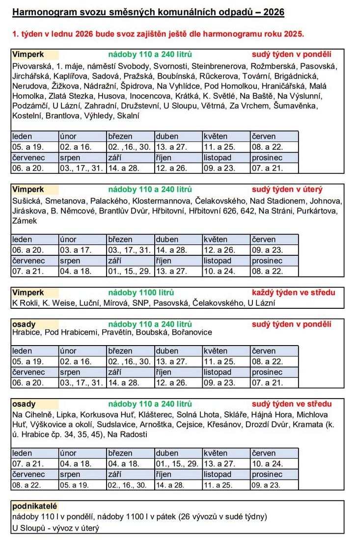 Domů AKTUÁLNĚ NAŠE MĚSTO VIMPERK – INFORMACE Z RADNICE: Harmonogram svozu směsného komunálního odpadu