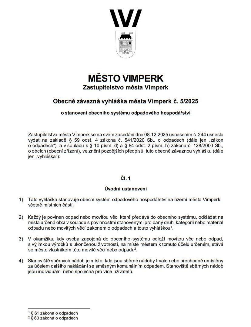 NAŠE MĚSTO VIMPERK – DOKUMENT: Vyhláška – systém odpadového hospodářství