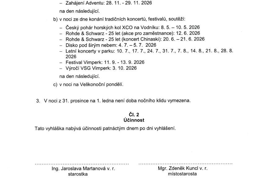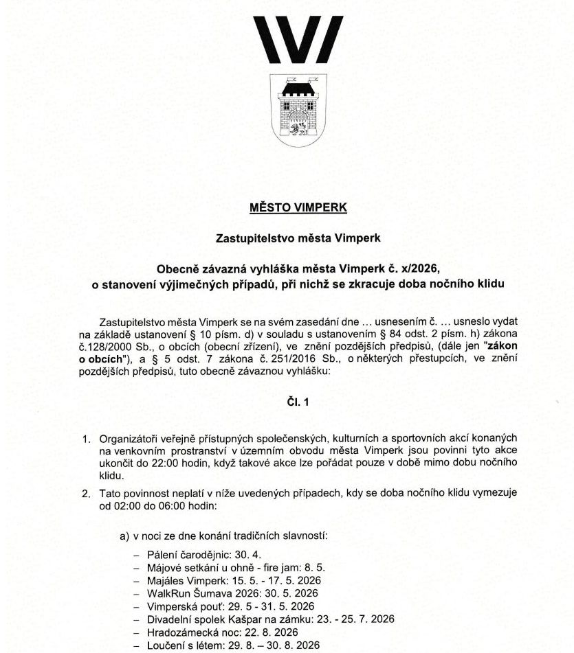 NAŠE MĚSTO VIMPERK – DOKUMENT: Vyhláška o stanovení výjimečných případů, při nichž se zkracuje doba nočního klidu