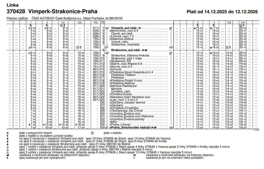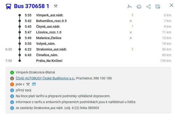 Současné zastávky na lince ČSAD Autobusy České Budějovice z Vimperka do Prahy: