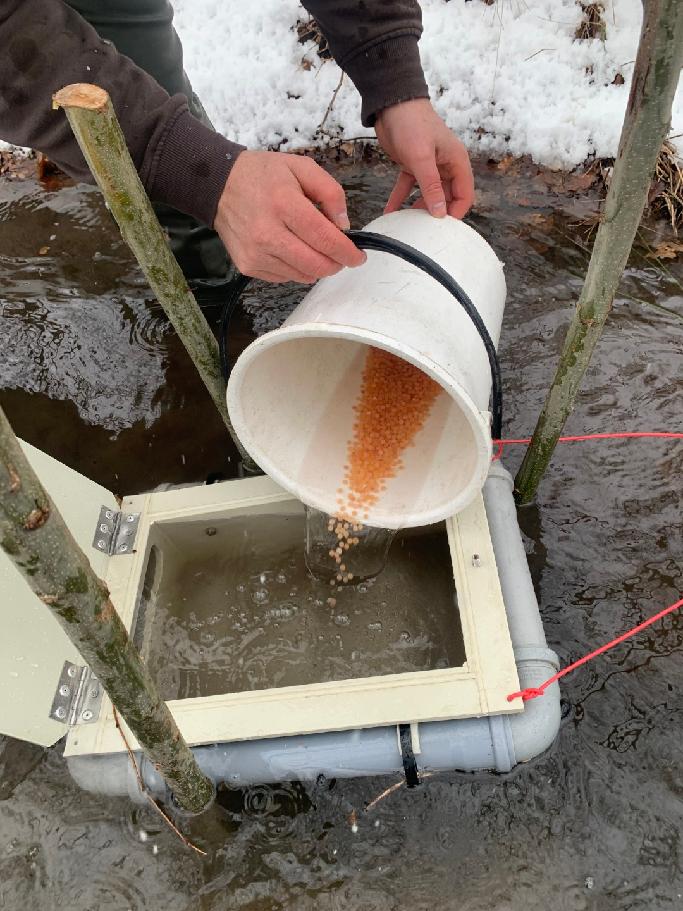 „Speciální plovoucí schránky chrání oplozené jikry před predátory i splavením,“ vysvětluje Zbyněk Morkus, vedoucí Správy toků pro oblast povodí Labe z Lesů ČR, a pokračuje: „V bezpečném prostředí se v nich vajíčka vyvíjejí až do vykulení plůdku, tedy malé rybky“.