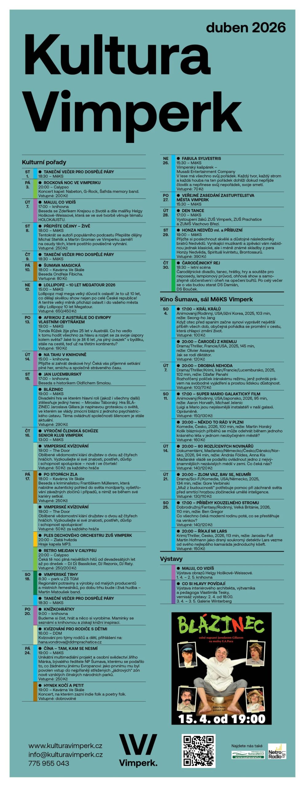 NAŠE MĚSTO VIMPERK: Kultura Vimperk. Přehled programů na duben 2026
