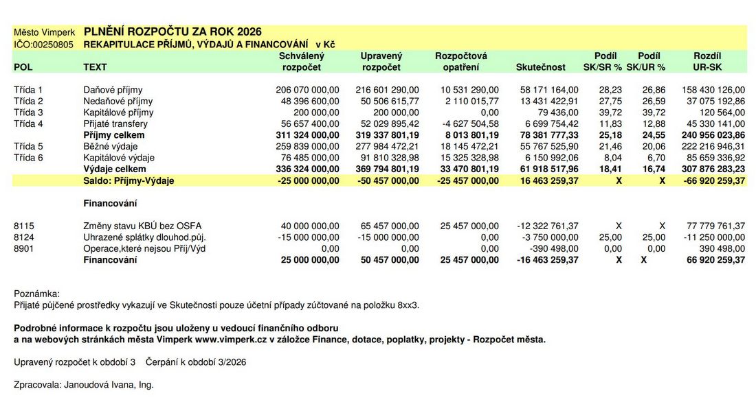 NAŠE MĚSTO VIMPERK: Radnice informuje o plnění rozpočtu k 31. 3. 2026