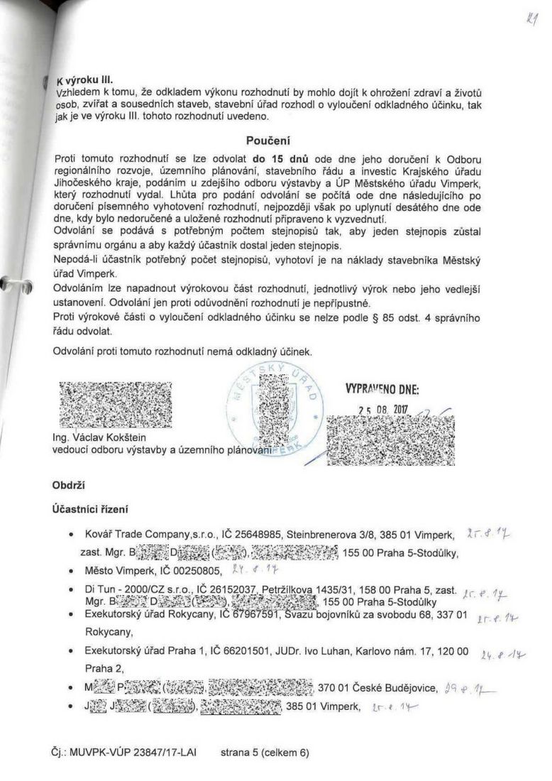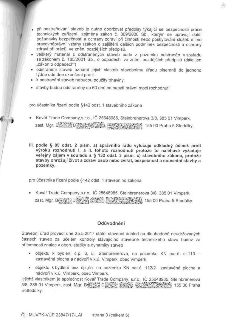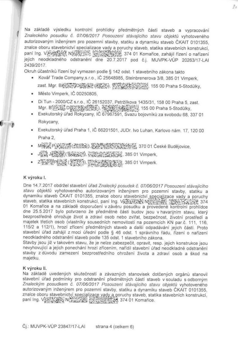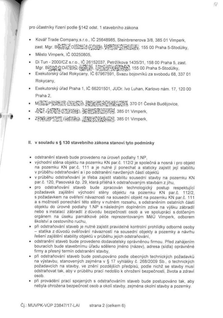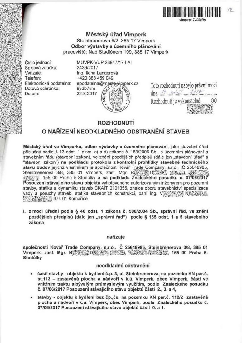 NAŠE MĚSTO VIMPERK – DOKUMENT: Rozhodnutí o nařízení neodkladného odstranění staveb