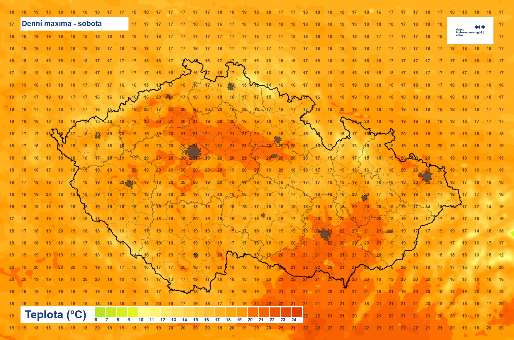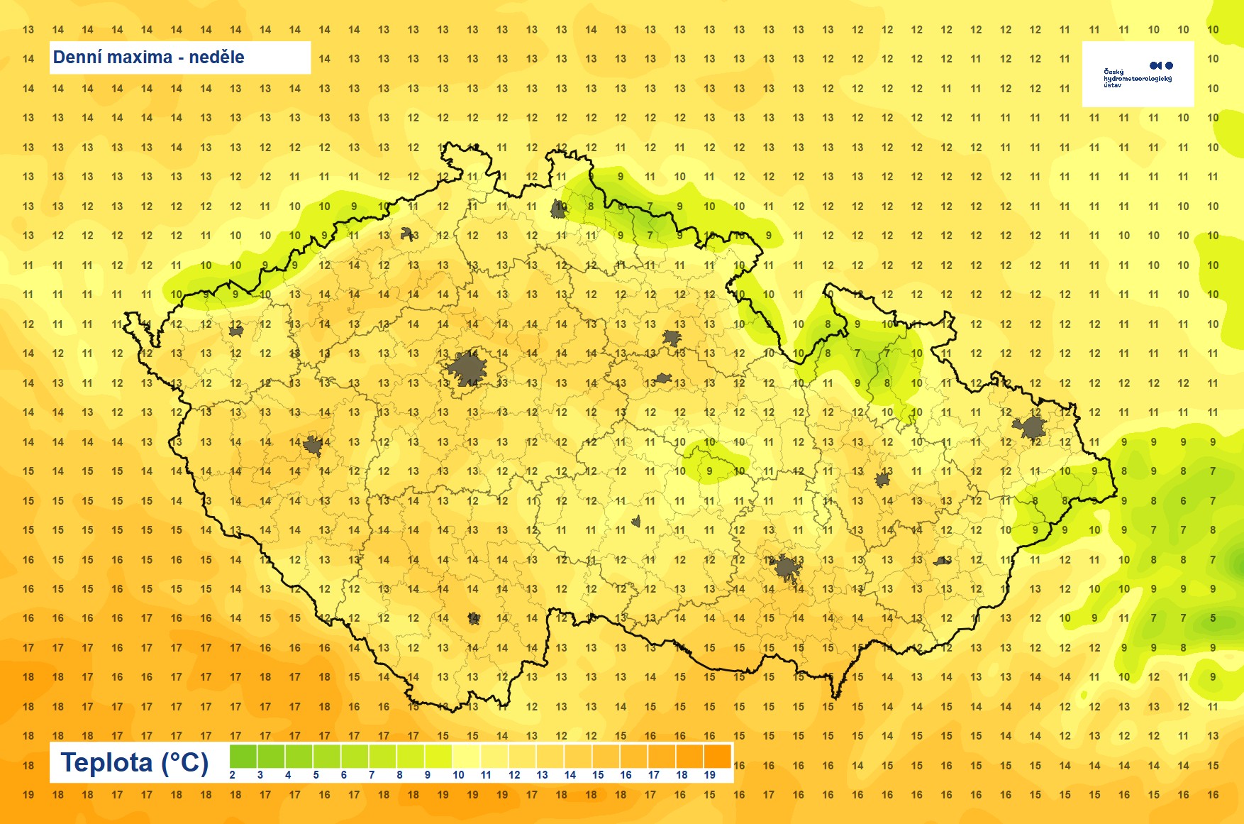 Minimální teploty budou nejčastěji od 7 do 2 °C, ale při slabém větru může teplota klesnout až k nule, v přízemní vrstvě tak může mrznout. Páteční maxima budou od 15 do 20 °C, na severu Čech kolem 13 °C, sobotní od 16 do 21 °C, ale na jižní Moravě by se teplota mohla dostat až ke 23 °C.