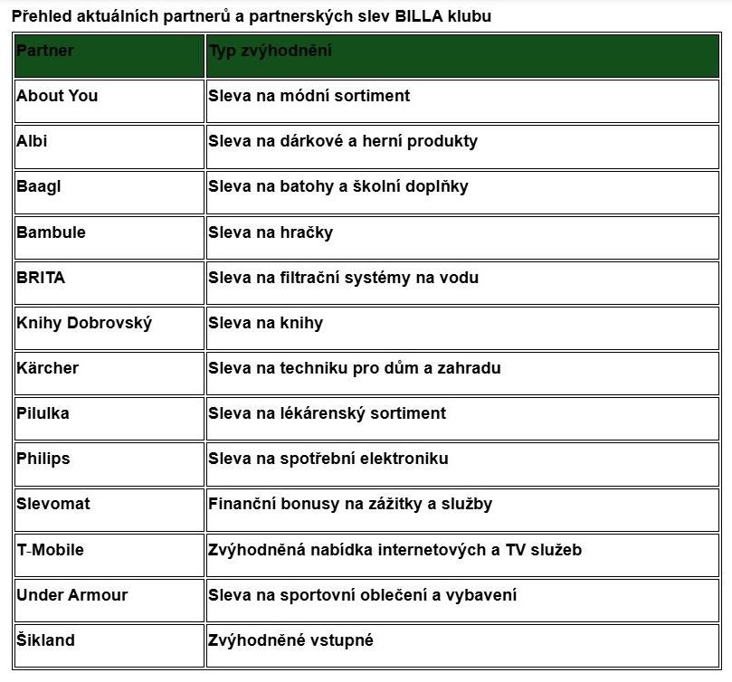Partnerské slevy jsou součástí BILLA klubu a rozšiřují jeho výhody o možnosti využitelné i mimo samotný maloobchod. Zákazníci tak mohou na jednom místě sledovat a čerpat zvýhodněné nabídky od partnerských značek zaměřené na každodenní potřeby i volný čas.