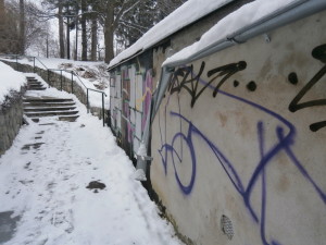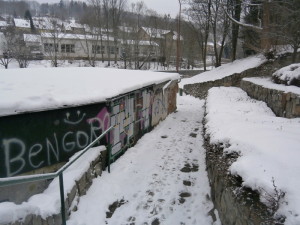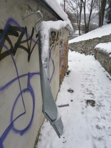 Z velké části poničený okapový žlab a svod několika garáží u parkoviště ve vimperském parku. Stav v sobotu 23. ledna v poledních hodinách. Kdopak to má na svědomí?