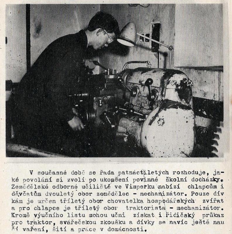 Do soustavy učňovských učilišť a středních škol ve Vimperku patřilo dříve také Zemědělské odborné učiliště. V lednu 1974 prezentovalo nabídku svých učebních oborů ve Vimperských aktualitách.