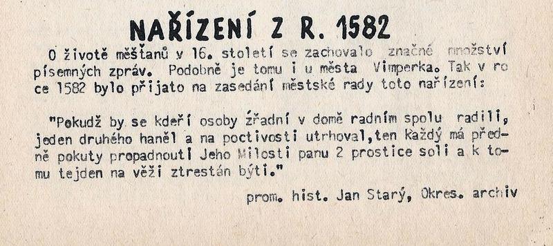 O životě měšťanů v 16. století se zachovalo značné množství písemných zpráv. Podobně tomu bylo i u města Vimperka, jak v březnu 1972 připomněly Vimperské aktuality. Přinesly také přepis nařízení městské rady z roku 1582: