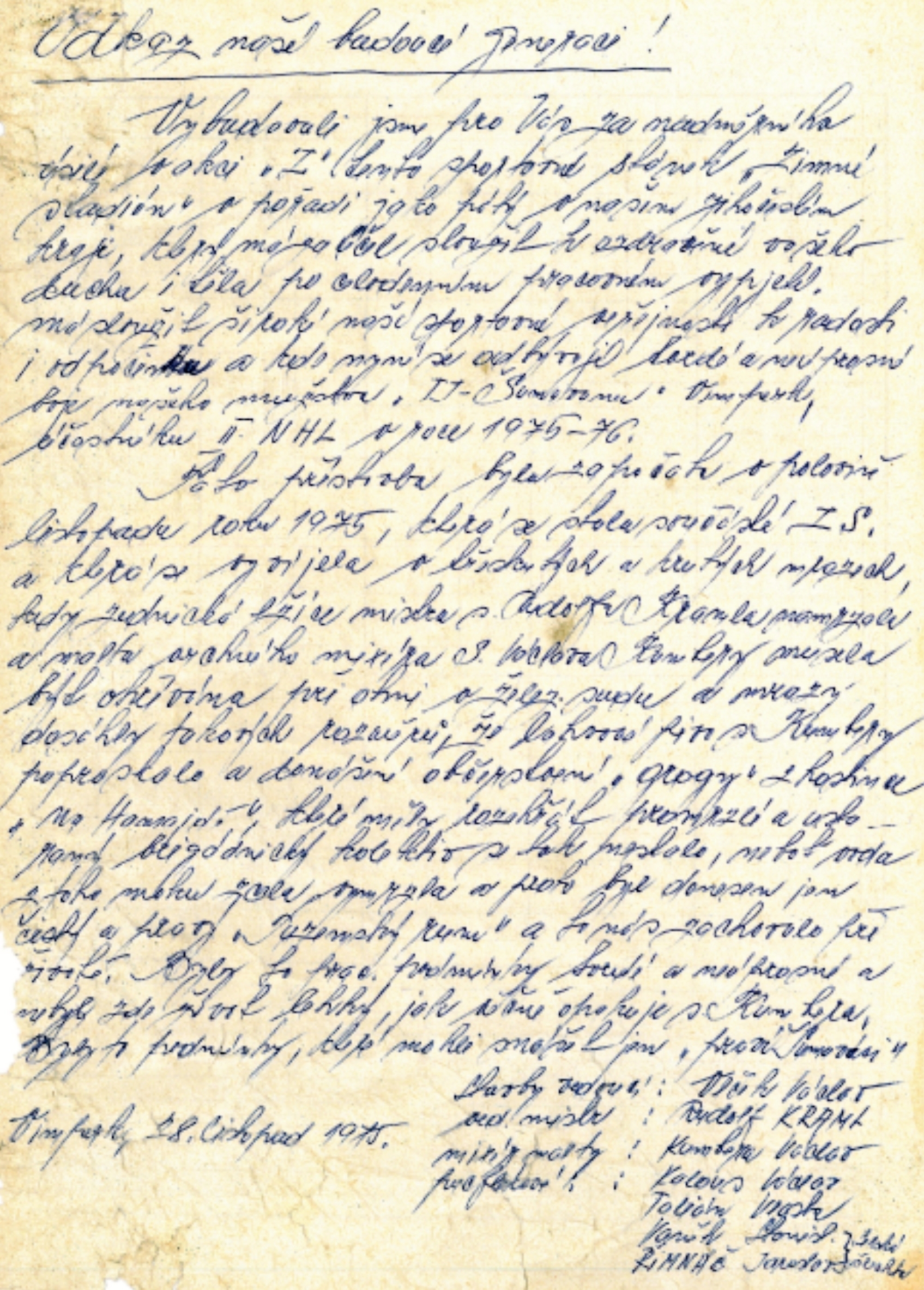 „Vybudovali jsme pro vás za nadměrného úsilí v akci „Z“ tento sportovní stánek „Zimní stadion“ v pořadí jako pátý v našem Jihočeském kraji, který má za účel sloužit k ozdravění vašeho ducha i těla po celodenním pracovním vypjetí,“ píše se ve vzkazu z láhve. Stavitelé chválí vimperský hokej a připomínají drsnou zimu těch let, kdy jim při stavbě namrzaly lžíce s maltou a při životě je zachoval jen pravý Tuzemský rum!